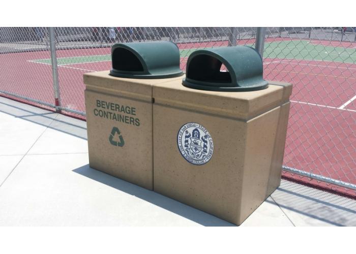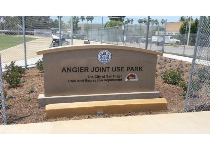 Another type of environment that benefits very well from concrete amenities is a school. One of our recent projects involved providing concrete amenities to Angier Joint Use Park, located in San Diego. This park is located on a portion of the Angier Elementary School grounds. Although it is part of Angier Elementary School, the public is allowed to use the park for recreation. Many improvements were made including basketball courts, drinking fountains, landscaping, and concrete amenities. We were able to provide picnic tables (including tables for ADA compliance), benches, trash and recycling receptacles, and a custom sign. The picnic tables were placed under a shade structure that covered the group picnic area. The tables were a combination of our models #109 and #112. Our model #112 provided the park with the required ADA compliance for tables. Trash and recycling receptacles were also placed at the park. The receptacles were equipped with heavy duty rain hats to keep water out. The trash cans included a cast in City of San Diego logo (also painted). The recycling receptacles had engraved recycling artwork, distinguishing them from the trash receptacles. Together, they were located in several areas of the park, providing the public and students an area to dispose of trash properly. Throughout the park, benches were provided near the courts for ample seating. The park also has a custom sign at the entrance. The sign displays the City of San Diego seal and Park and Recreation logo. The sign also features an integral curved cap, multiple textures, and a base to add height to the sign.