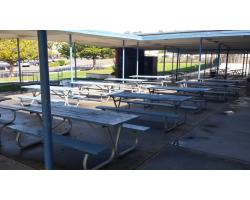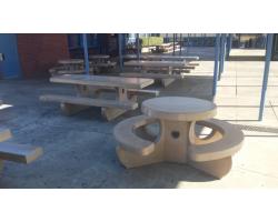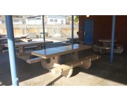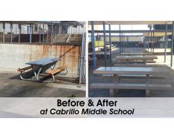 Cabrillo Middle School came to us in need of replacing old picnic tables and benches at their school. They were having issues with the costly maintenance and vandalism with the wood tables they had at the time. The tables are outside and would be exposed to the elements. Overtime, wood tables deteriorate and the school needed a solution. As part of the project, we assisted the principal with layout options of rectangle and round tables. We manufactured 100SSK (rectangle tables with anti-skate bumps) and 106S with nano sealer. Our nano sealer is a great option for schools, making lunch time artwork a breeze to remove. Now the school won't have the costly repair issues and the kids have a sturdy, durable place to enjoy lunch. The before and after photos are a great example of how we can help upgrade to concrete amenities.